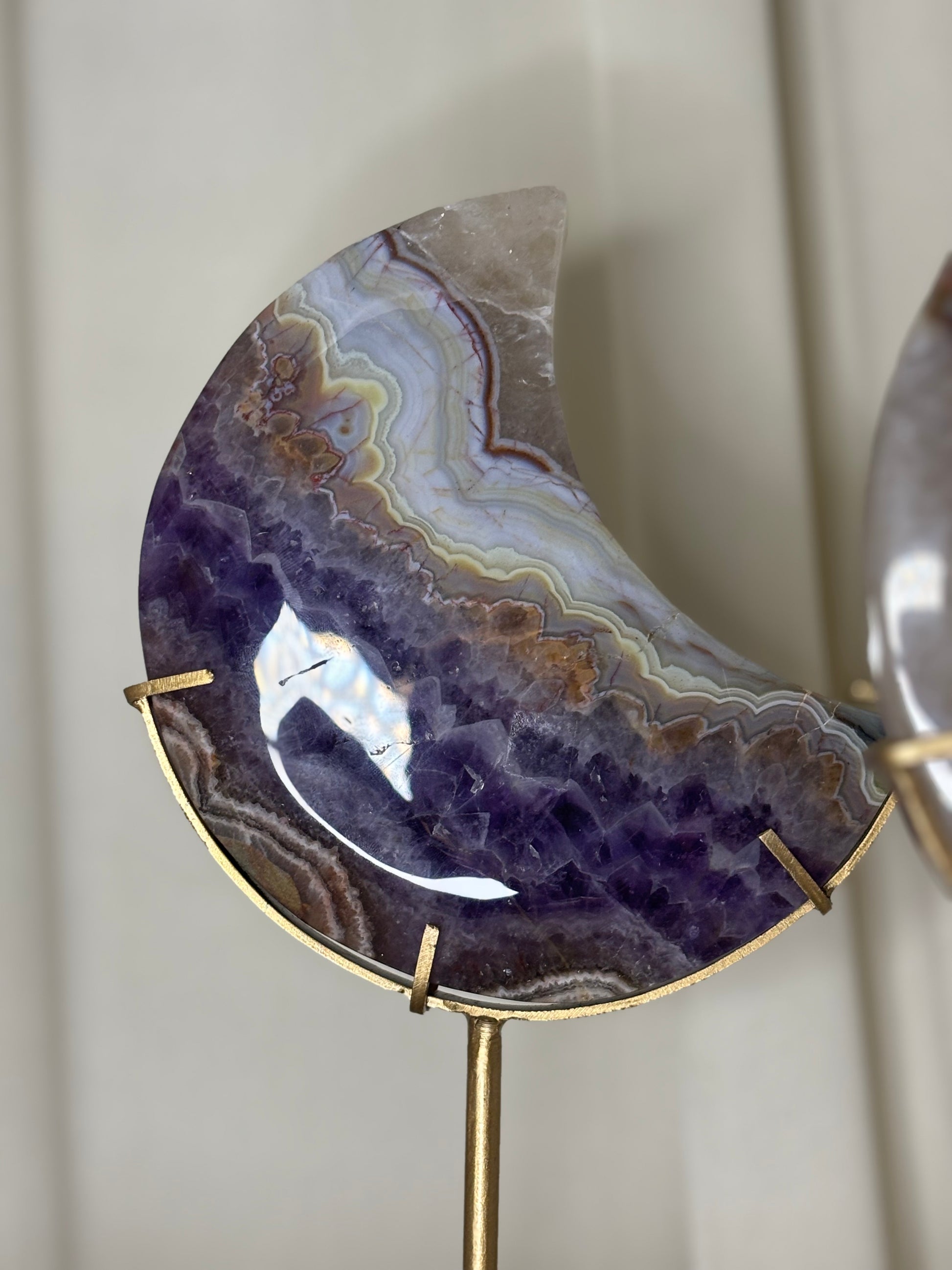 Elevate your space with the radiant beauty of these Boho Amethyst Moons, elegantly set on sleek gold stands. Each moon features mesmerizing natural banding, blending deep purples with earthy tones of Crazy Lace Agate — a one-of-a-kind fusion of grounding and glow. The gold stand adds a luxe, modern touch, making it the perfect centerpiece for your altar, shelf, or sacred space.
