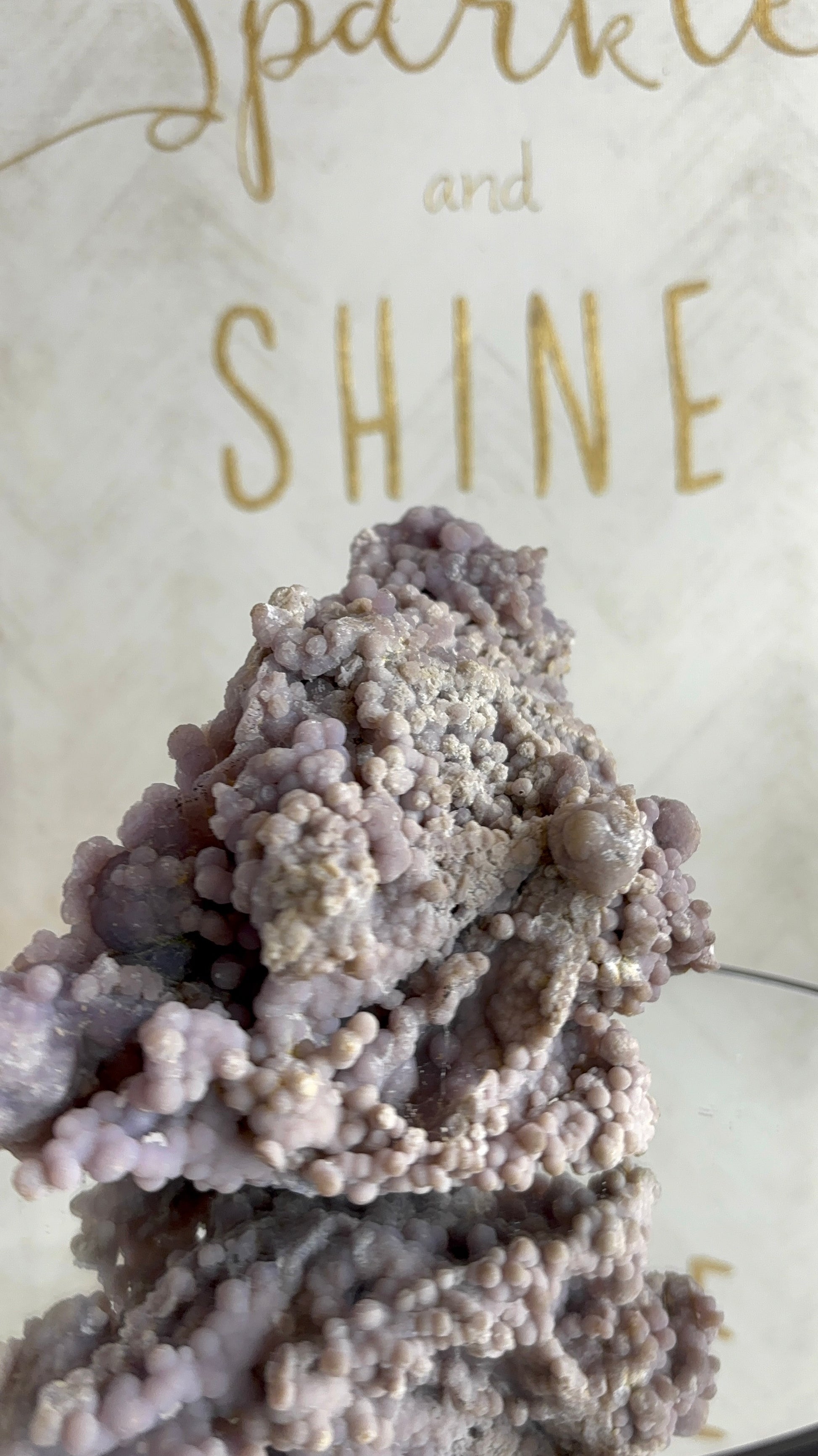 This stunning Grape Agate cluster showcases a mesmerizing formation of botryoidal chalcedony in soft lavender and lilac hues. Resembling a cluster of tiny grapes, this rare crystal is known for its calming energy, intuitive enhancement, and deep spiritual connection. A must-have for collectors and crystal enthusiasts, this piece is a striking display of nature’s artistry.